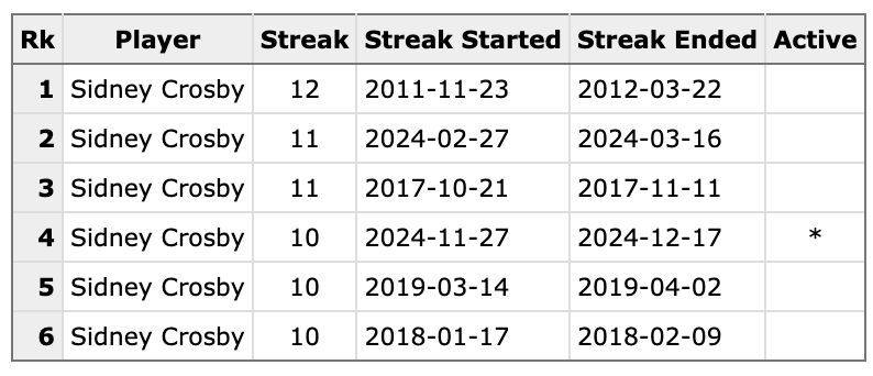 After scoring his 600th goal, Sidney Crosby has not scored a goal in his last 10 games. It's only his 6th career goal-less streak of at least 10+ games.